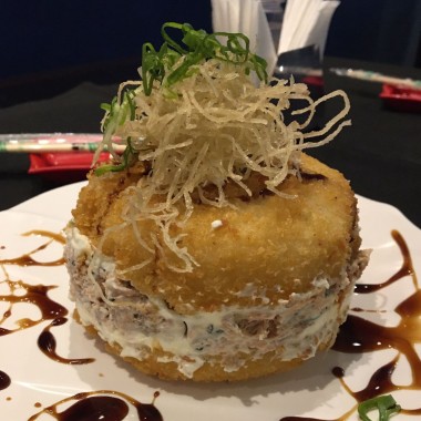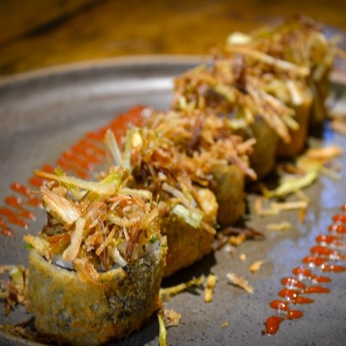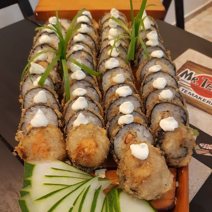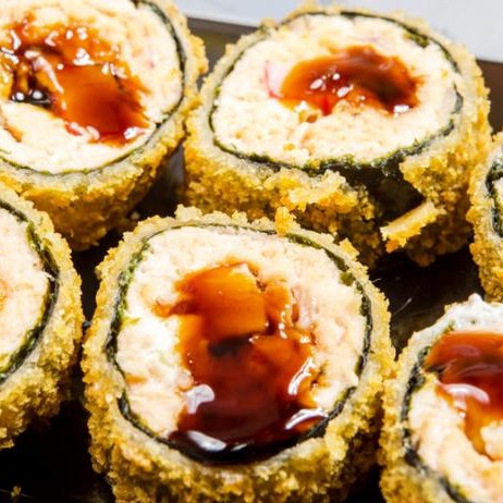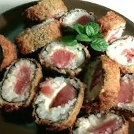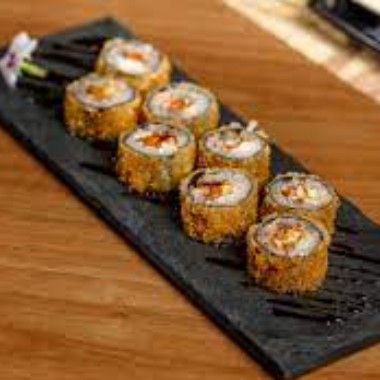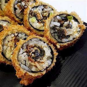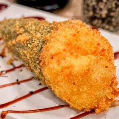 Alga, arroz, atum, cream cheese, cebolinha e gergelim, empanado e frito na farinha panko.