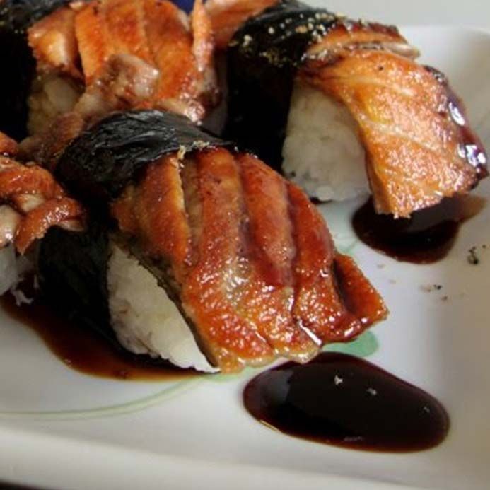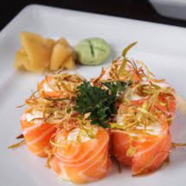 tempura de camarao e cream cheese enrolados em fatia de salmao flambado com teriaky, geleia de pimenta e fatia de limao por cima
