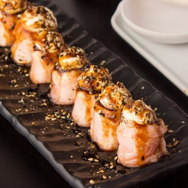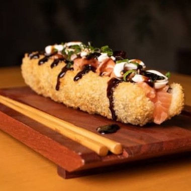 Pensado para os fãs de hot esse é o nig hot crocante! Recheado com creme cheese,salmão, Cebolinha,teriaky e gergelim.