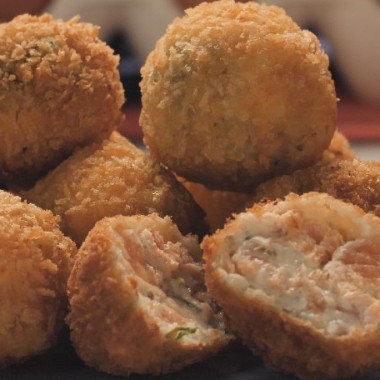 massa de salmão, cream cheese, cebolinha e gergelim, fritas na farinha panko.