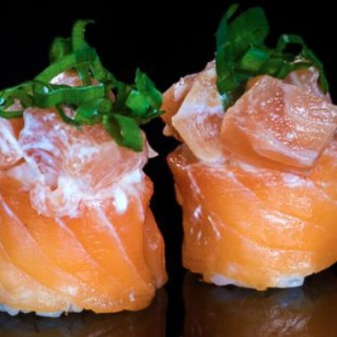 Lâmina de salmão cru, arroz, cream cheese e alho poró crocante por cima.