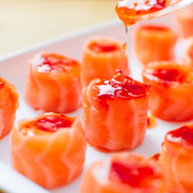 laminas de salmao, arroz, cream cheese e geleia de pimenta