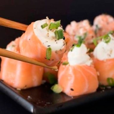 laminas de salmao, arroz, cream cheese e cebolinha