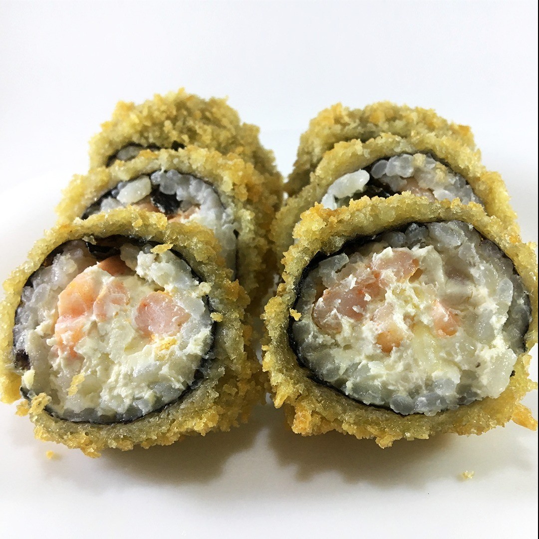 Arroz empanado em formato de pao frito na farinha panko, com recheio de camarão, salmão, cream cheese, cebolinha e gergelim