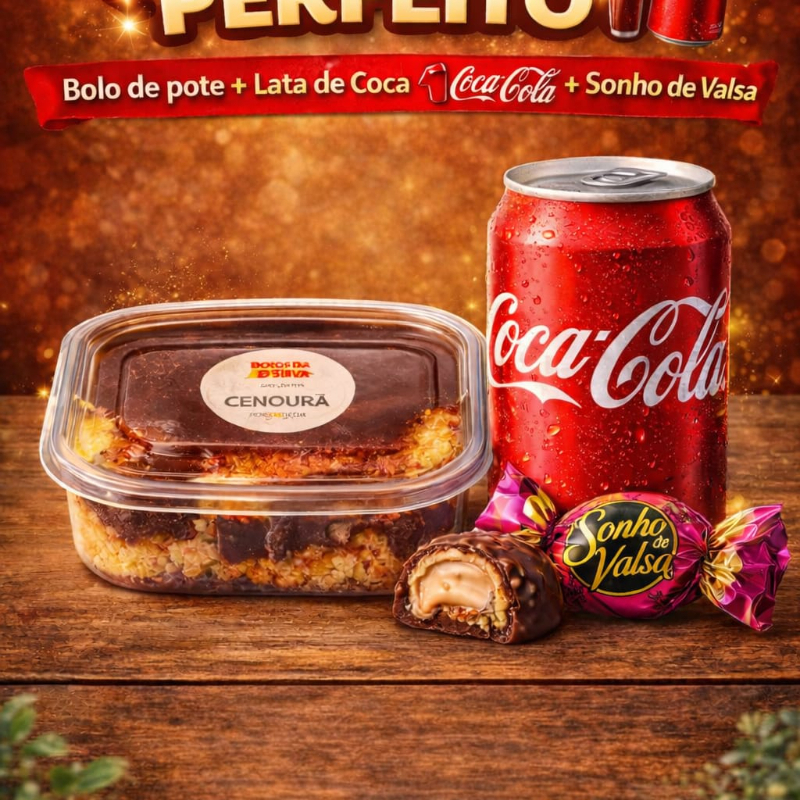 Bolo de pote + coca em lata e nosso doce queridinho bombom sonho de valsa