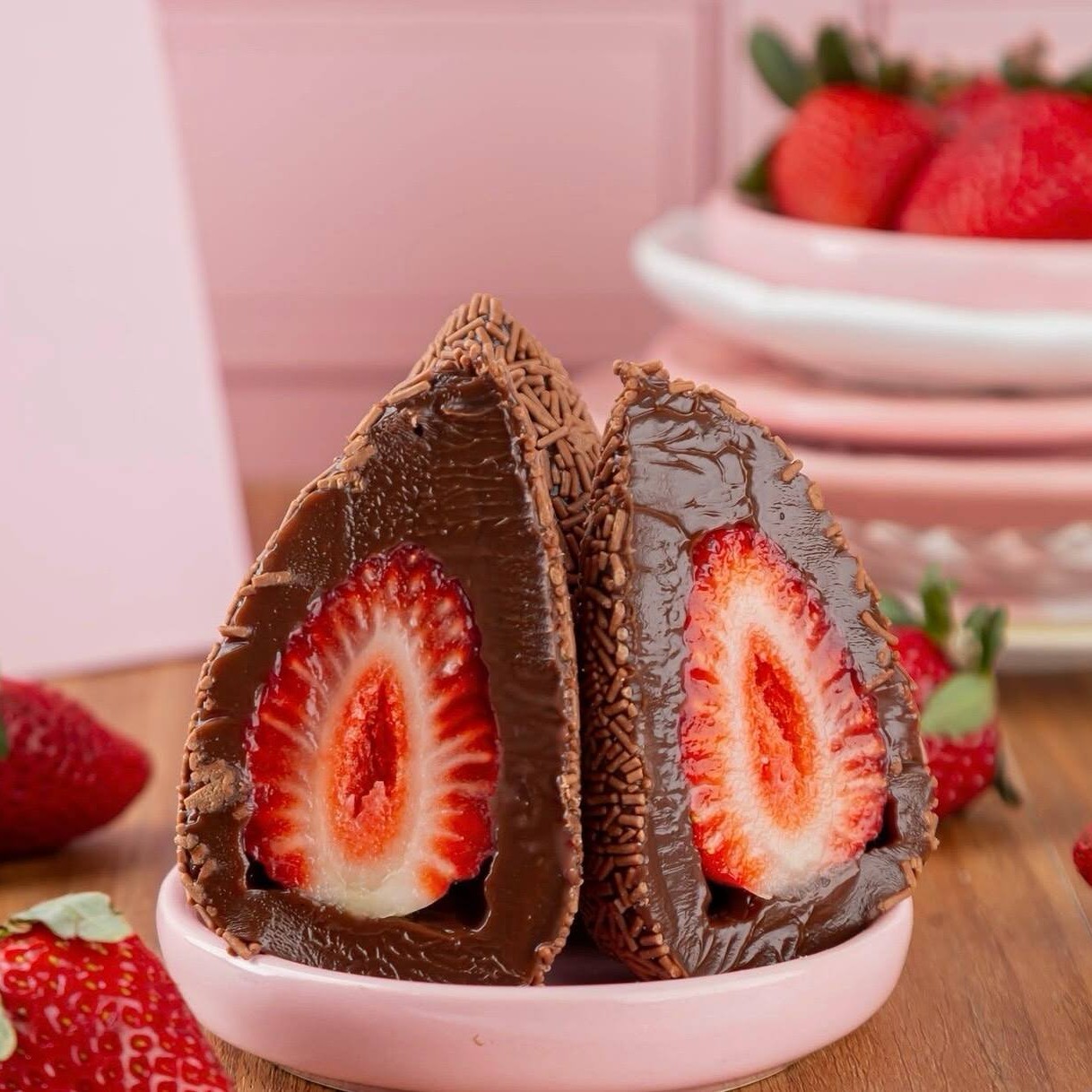 3 bombons de morango com recheio de brigadeiro de moça e um delicioso morango, com uma casquinha deliciosa de chocolate!