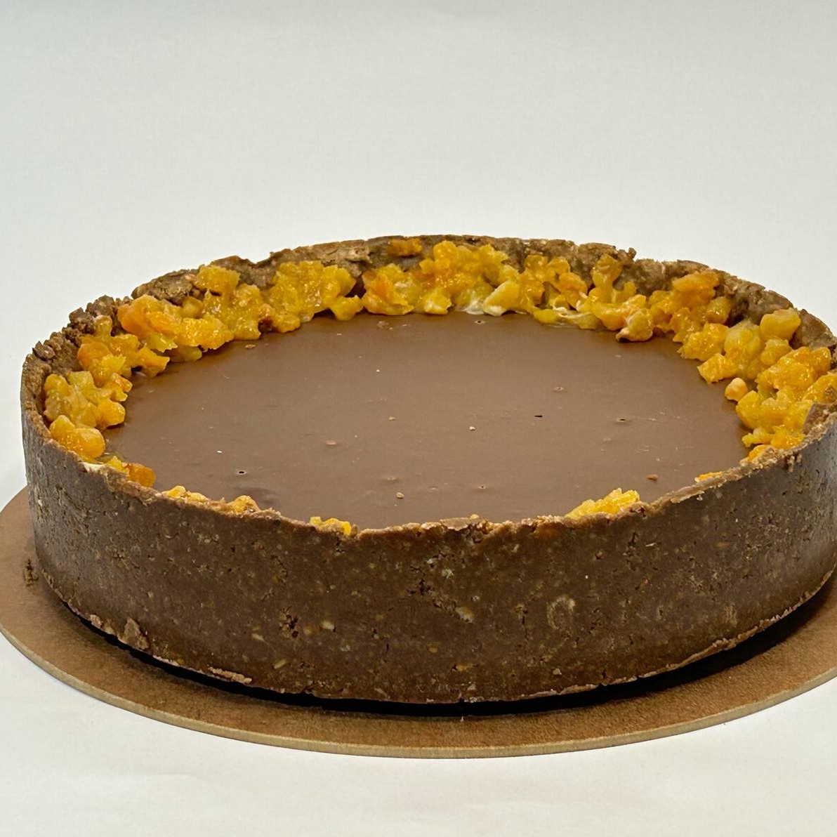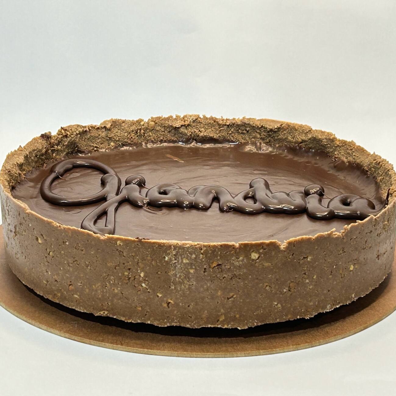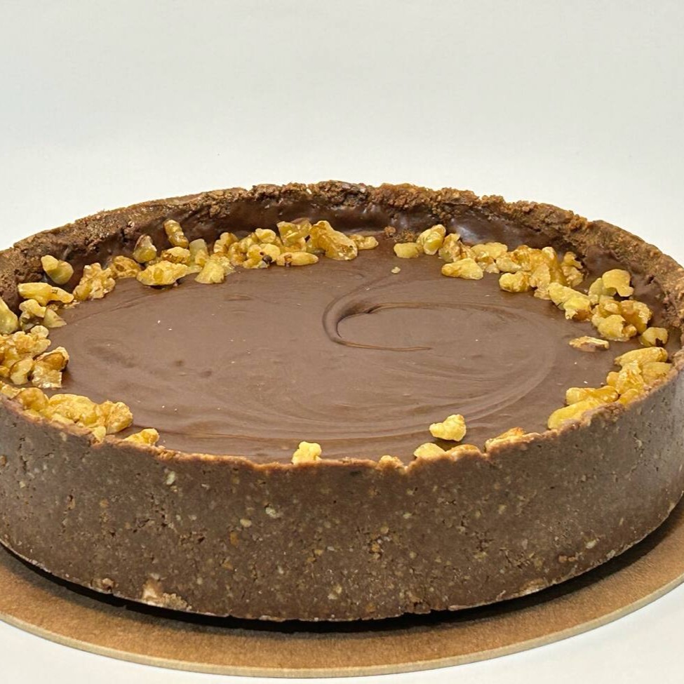 Torta de trufa de chocolate meio amargo e nozes picadas, e envolvida em uma casquinha de biscoito de chocolate