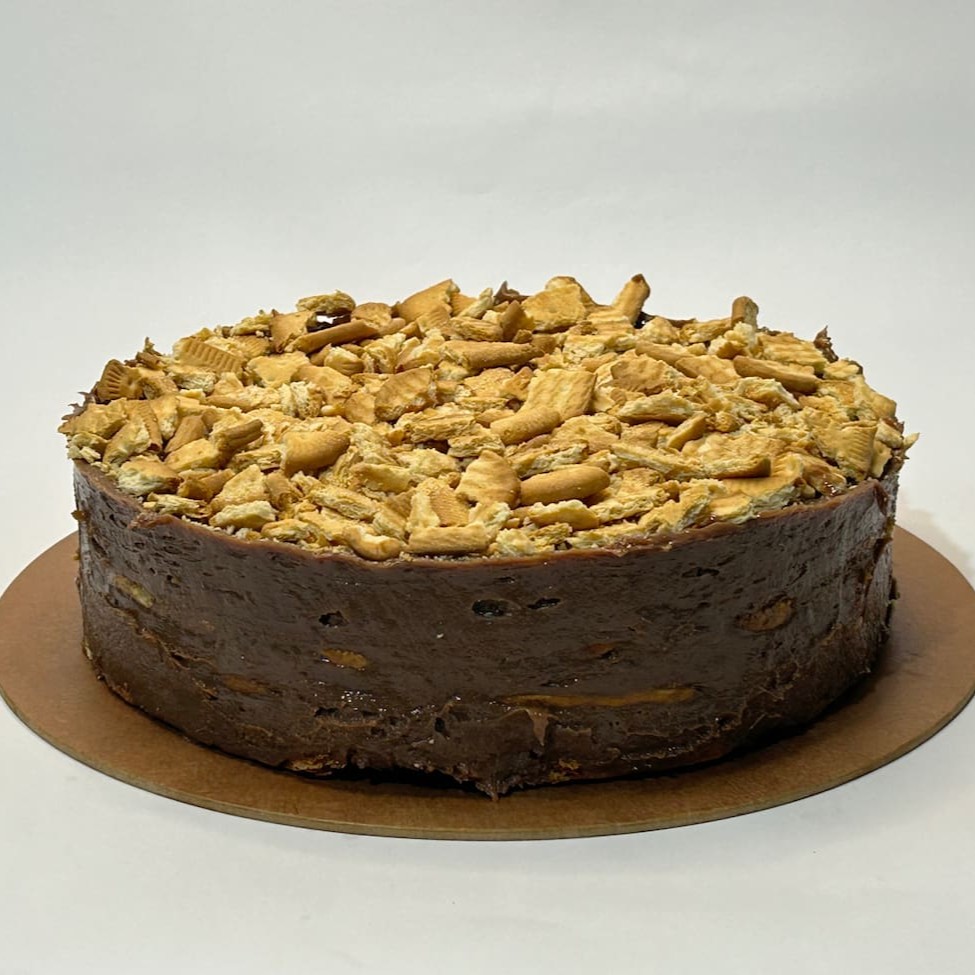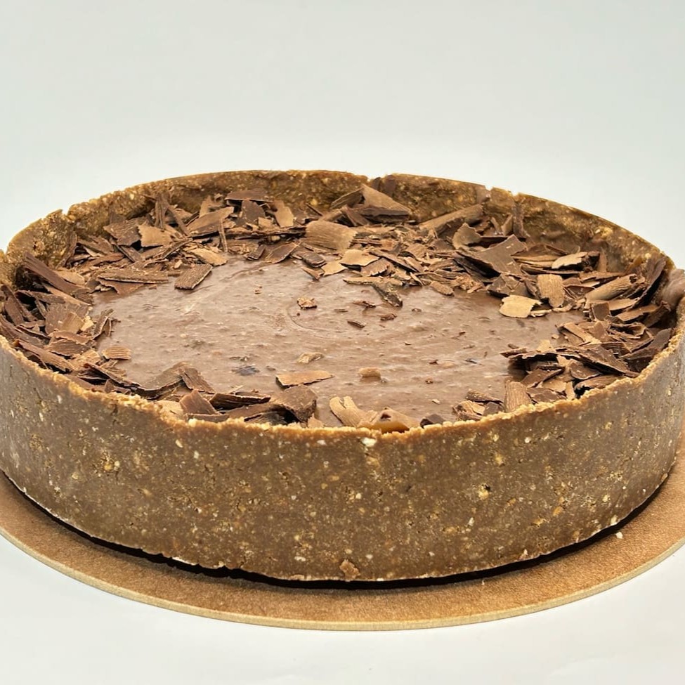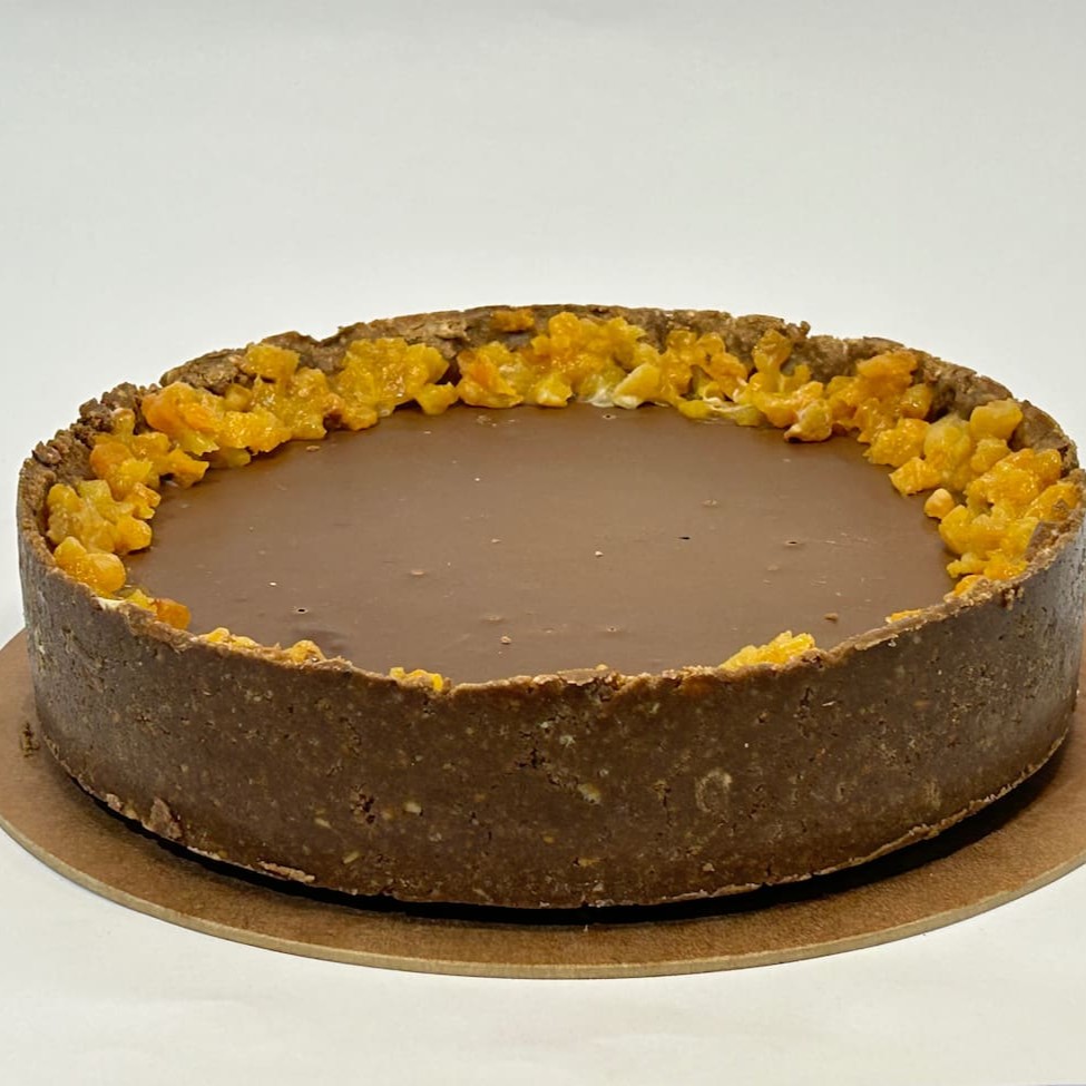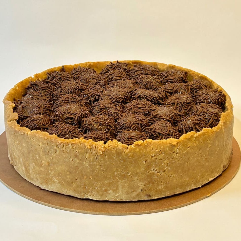 Torta Composta por trufa de chocolate meio amargo, chocolate ao leite e chocolate branco envolvida em uma casquinha de biscoito de chocolate.
