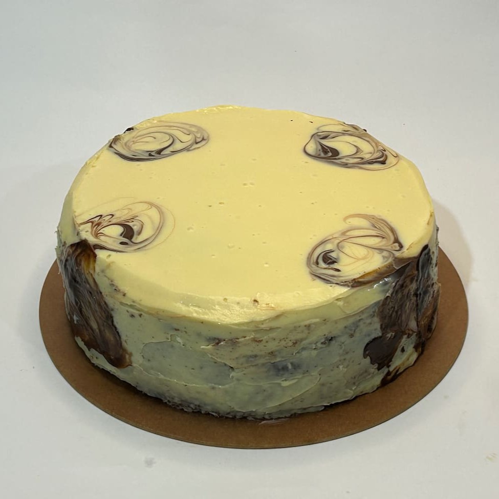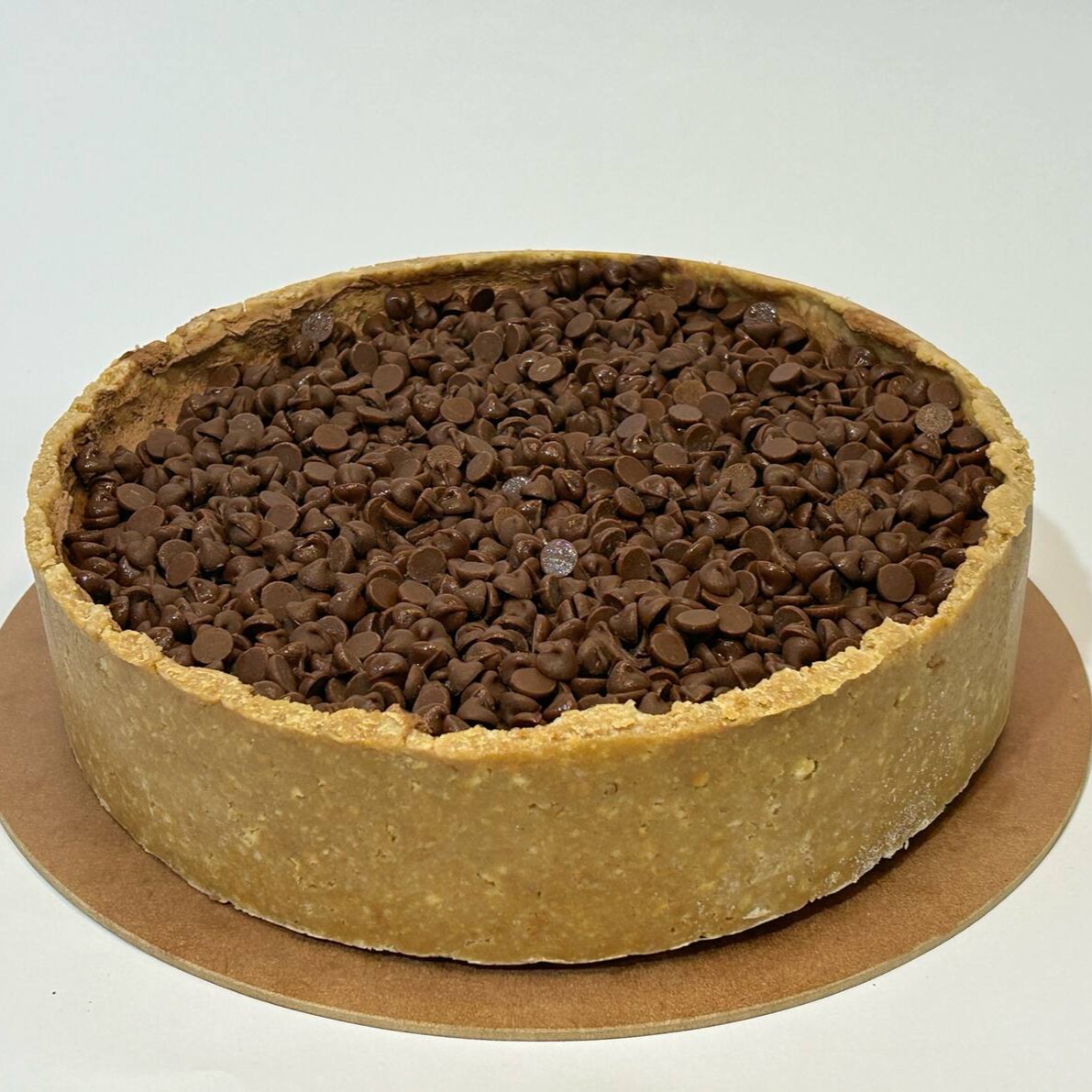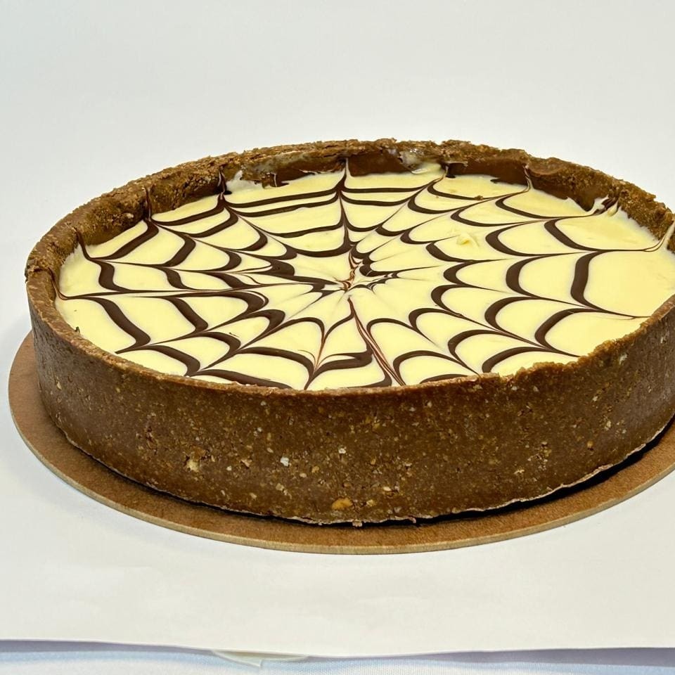 Torta Composta por trufa de chocolate meio amargo, chocolate ao leite e chocolate branco envolvida em uma casquinha de biscoito de chocolate.