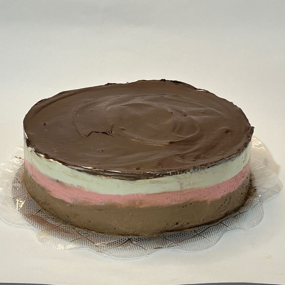 Torta composta com um disco de bolo de chocolate com uma mousse de chocolate, mousse de morango e mousse de chocolate branco e cobertura de chocolate