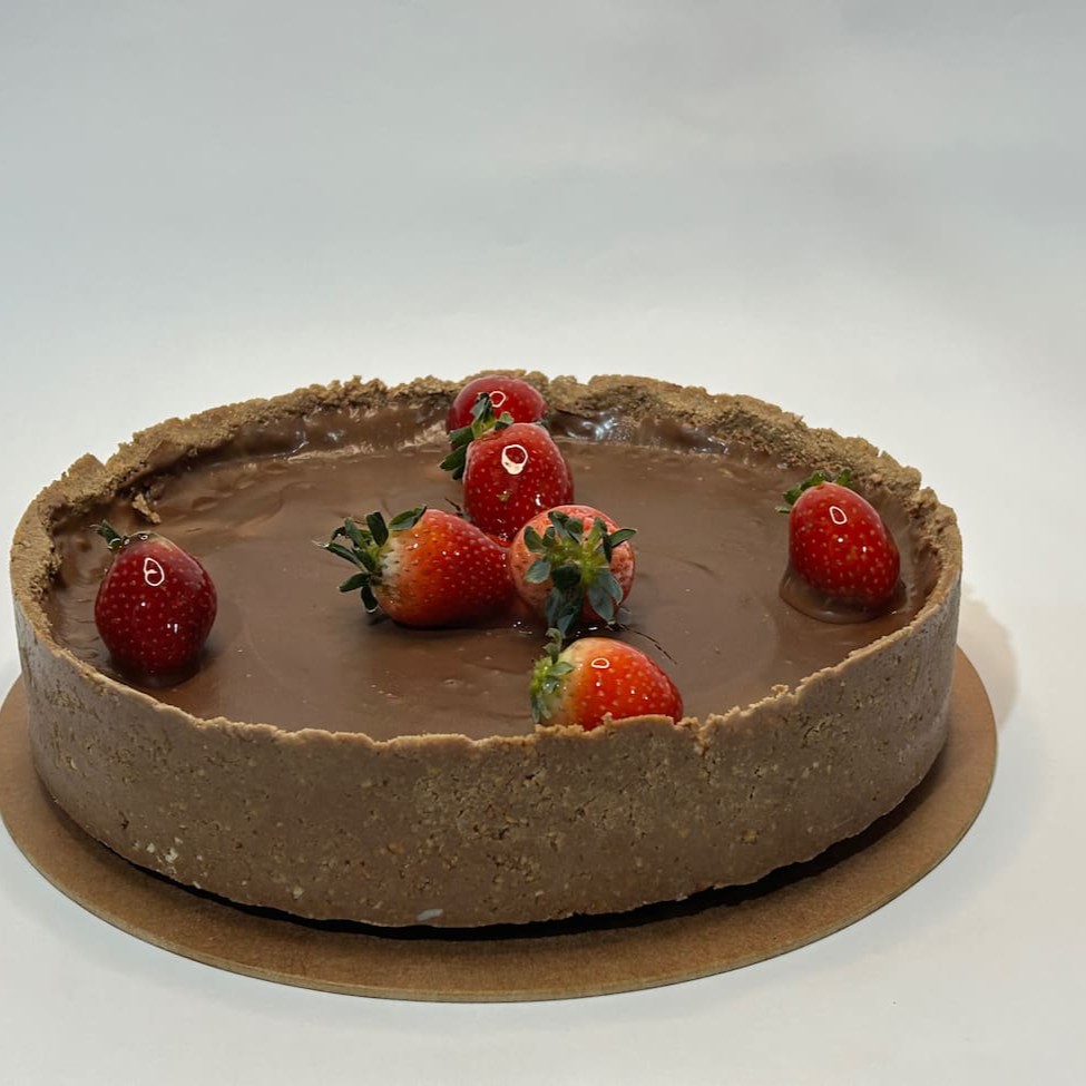 Torta feita com trufa de chocolate meio amargo com pedaços de morangos envolvida com casquinha de biscoito de chocolate