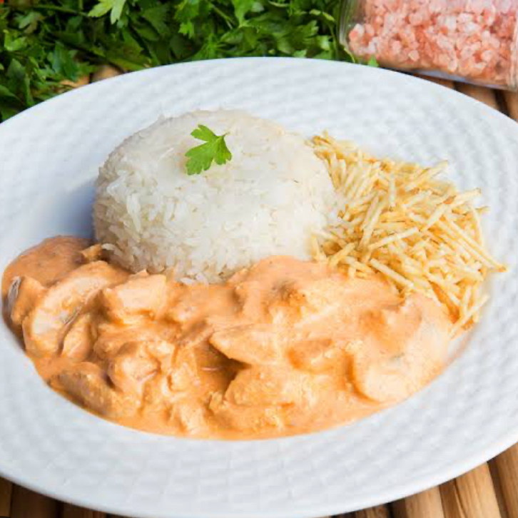 Estrogonofe de frango cremoso com champignon, servido com arroz e batata palha crocante.