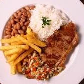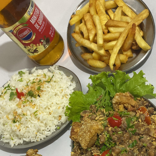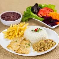 FILE DE FRANGO, ARROZ, FEIJAO, BATATA, FAROFA E MOLHO ACAMPANHA.