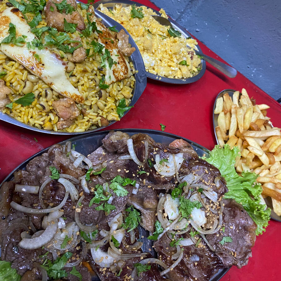 1 seu Jose( uma suculenta carne de sol acebolada com Baião e aipim frito) Dona Maria(uma suculenta carne de sol acebolada com feijao tropeiro, arros branco e aipim fritinho)