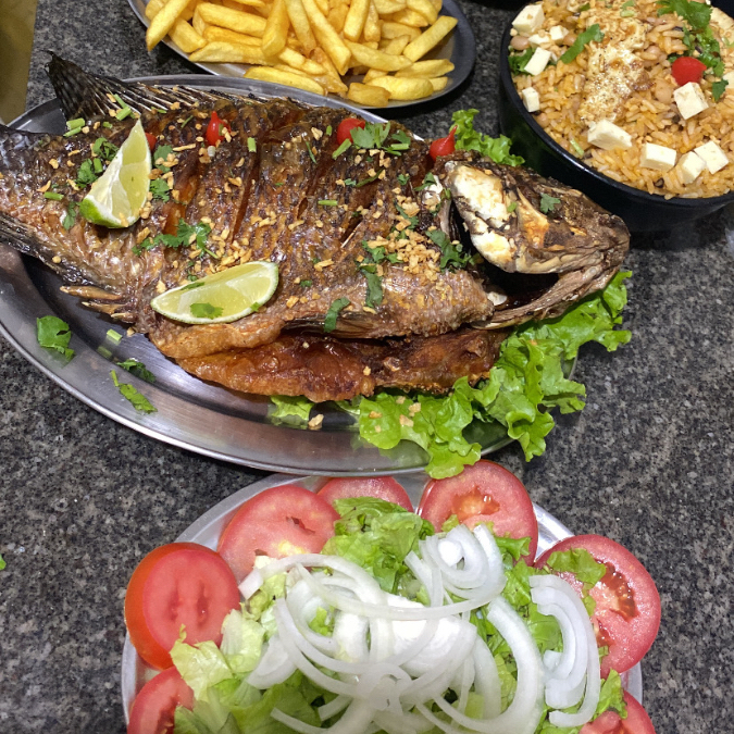 BAIÃO OU ARROS FEIJAO,POSTA DE TILÀPIA BATATA, SALADA E FAROFA .