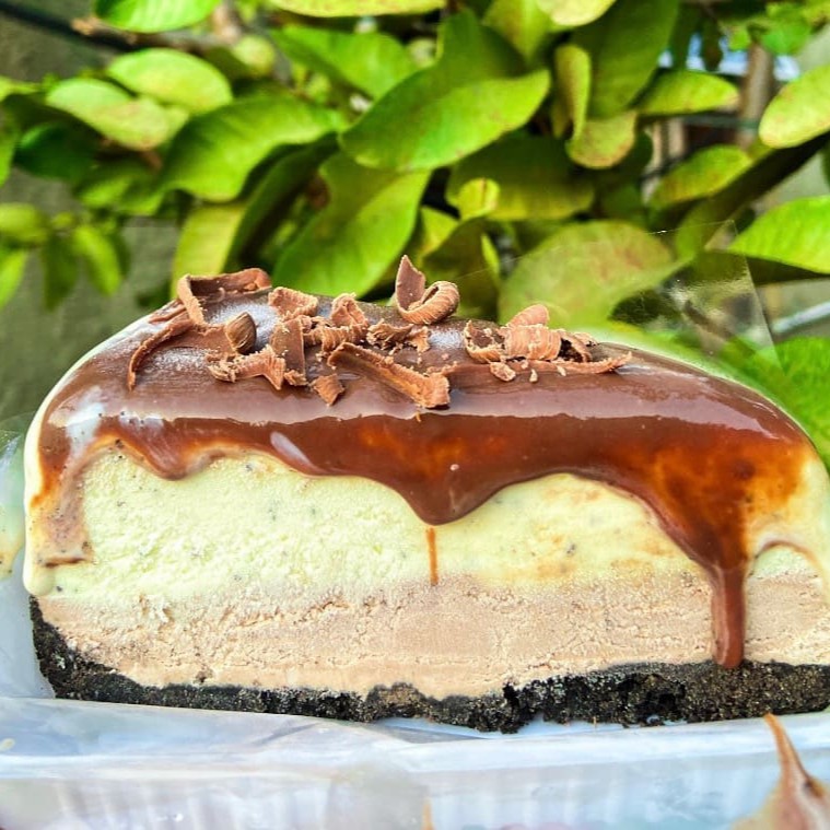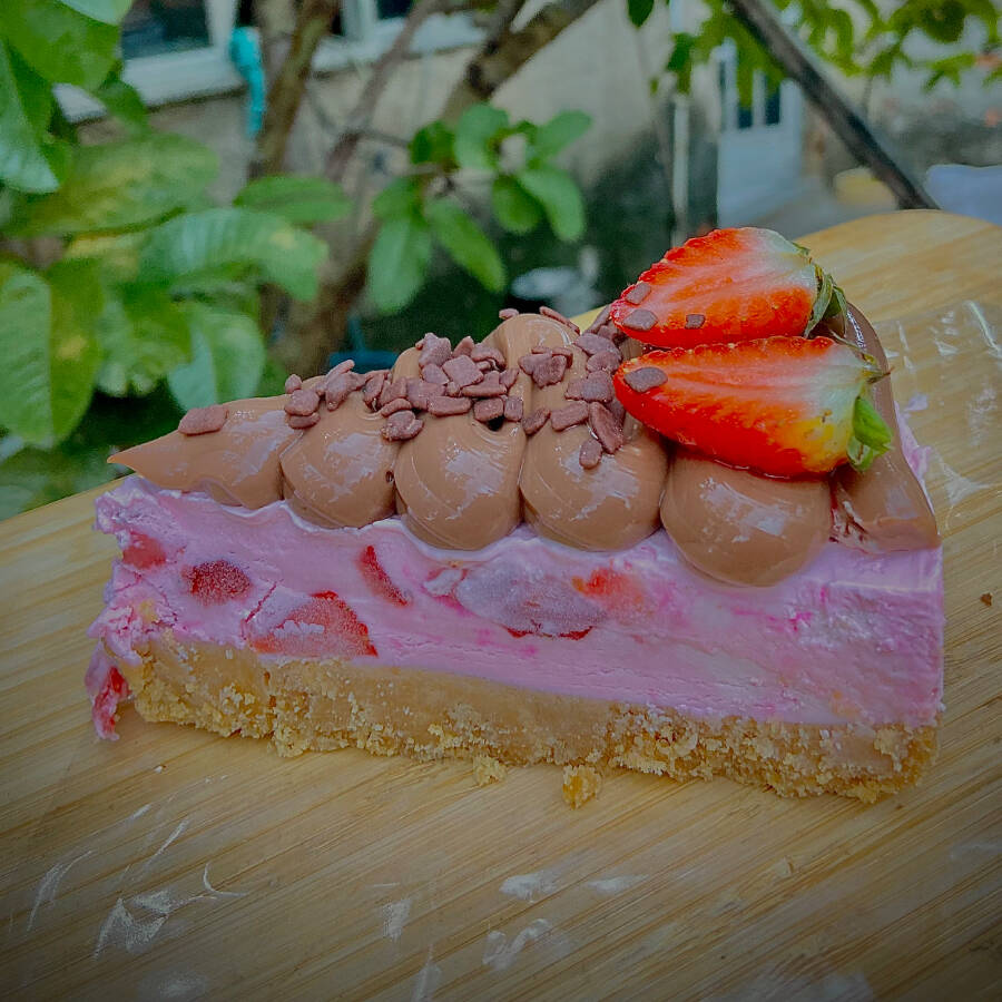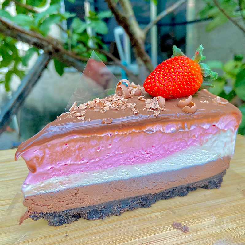 Base de biscoito black crocante, 1 camada de mousse chocolate 50% cacau, 1 Camada de mousse de creme gourmet branco, 1 Camada de mousse de morango 🍓. Finalizado com uma ganache de chocolate ao leite e raspas de chocolate, acompanhado de um morango para decoração.