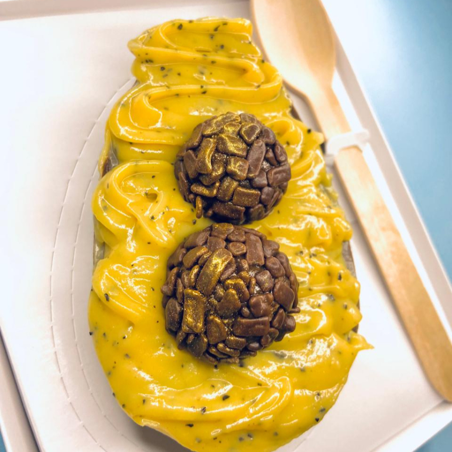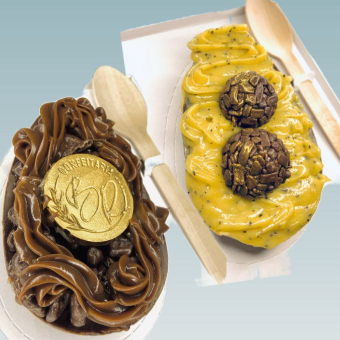 Casca ao leite, recheado com brigadeiro de chocolate 50% cacau, e brigadeiro de maracujá cremoso. Finalizado com brigadeiro de chocolate. Pesando 200g