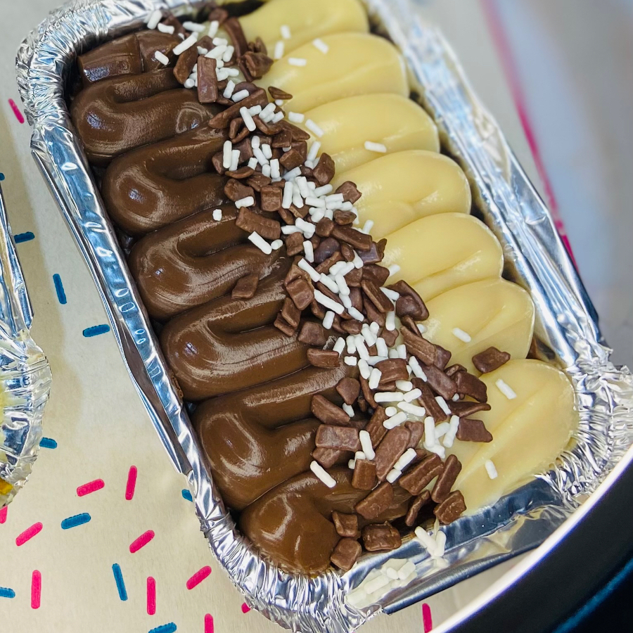 Brigadeiro de chocolate 50% cacau, brigadeiro de ninho cremoso. Finalizado com granulados ao leite