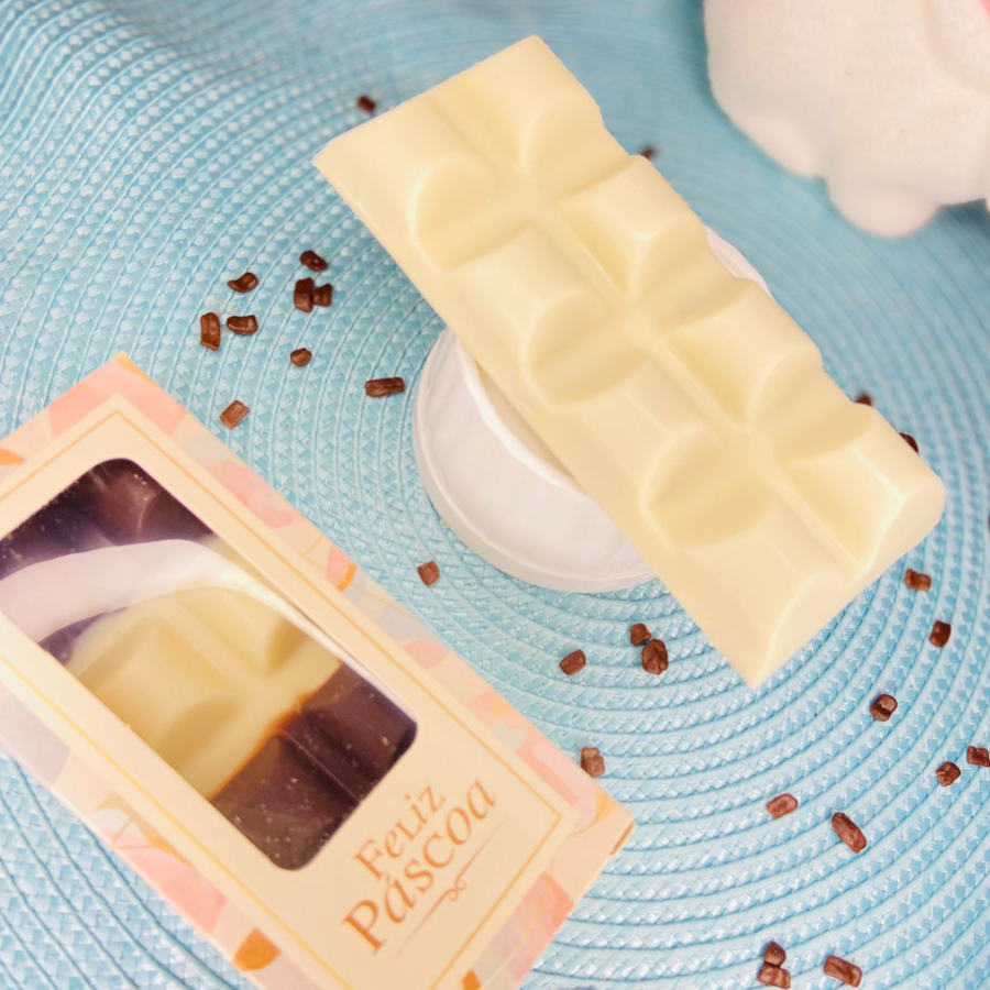 Barra de chocolate ao leite branca ou preta, pesando 90g , nos recheios favoritos que voces ja conhecem. Acompanha bolsa personalizada de páscoa para voce presentear.