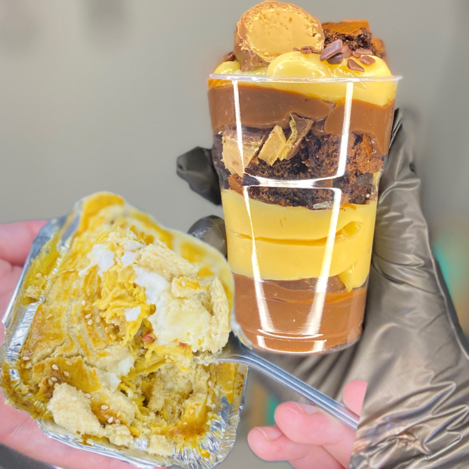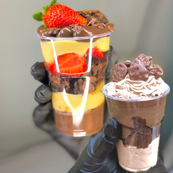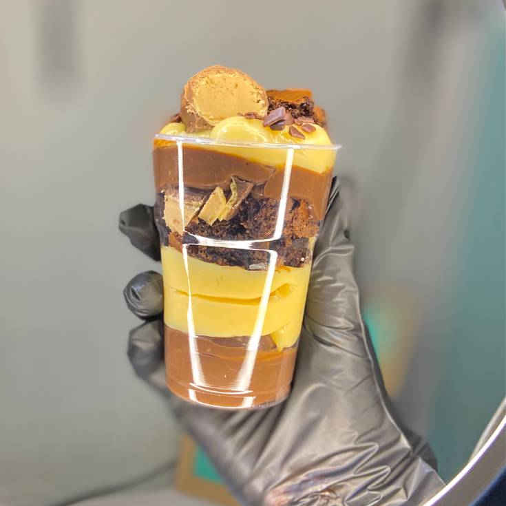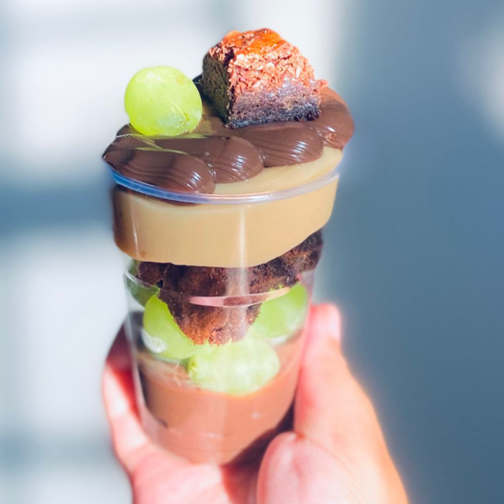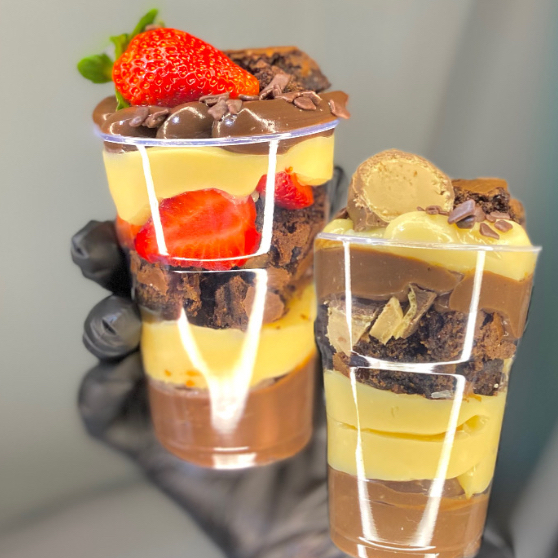 Uma explosão de sabor para os verdadeiros chocólatras! Começamos com uma cremosa mousse de Ovomaltine Rocks, cheia de crocância e sabor único. Em seguida, camadas generosas de brownie artesanal super macio, intercaladas com o sabor marcante da Nutella. O toque especial fica por conta do nosso brigadeiro gourmet de chocolate 50% cacau, que equilibra perfeitamente o doce com intensidade. Para fechar com chave de ouro, uma chuva de Ovomaltine Rocks no topo, trazendo aquela crocância irresistível em cada colherada.