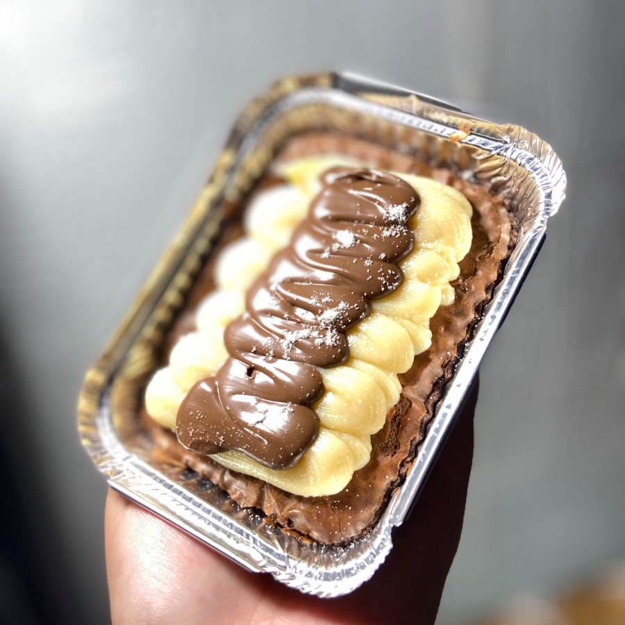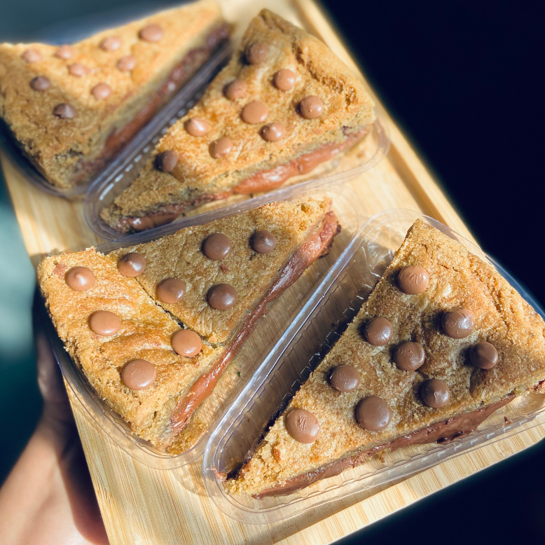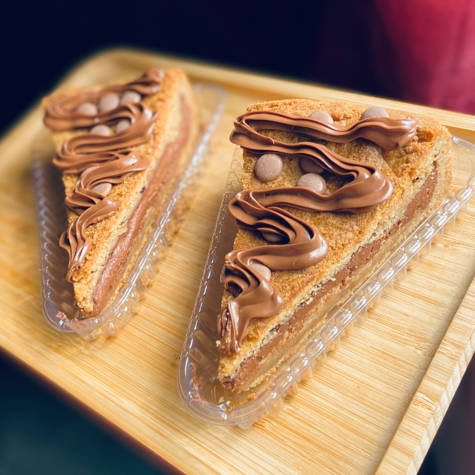 Massa de cookie super deliciosa, brownie molhadinho, finalizado com Nutella por cima. Pesando Aprox 150g, serve 1 pessoa.