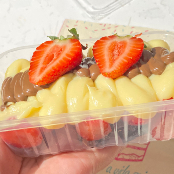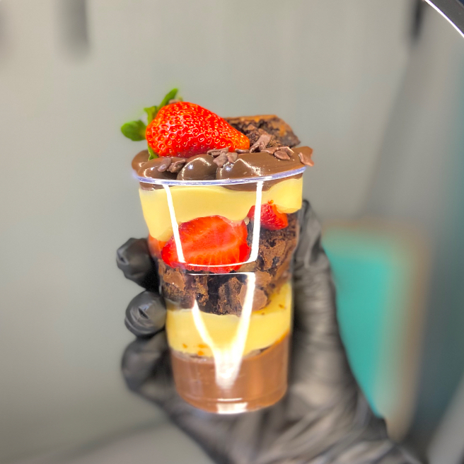 Uma camada do nosso brownie molhadinho e geladinho, uma camada de morangos picados frescos, brigadeiro de Ninho cremoso finalizado com Nutella por cima! 200ml