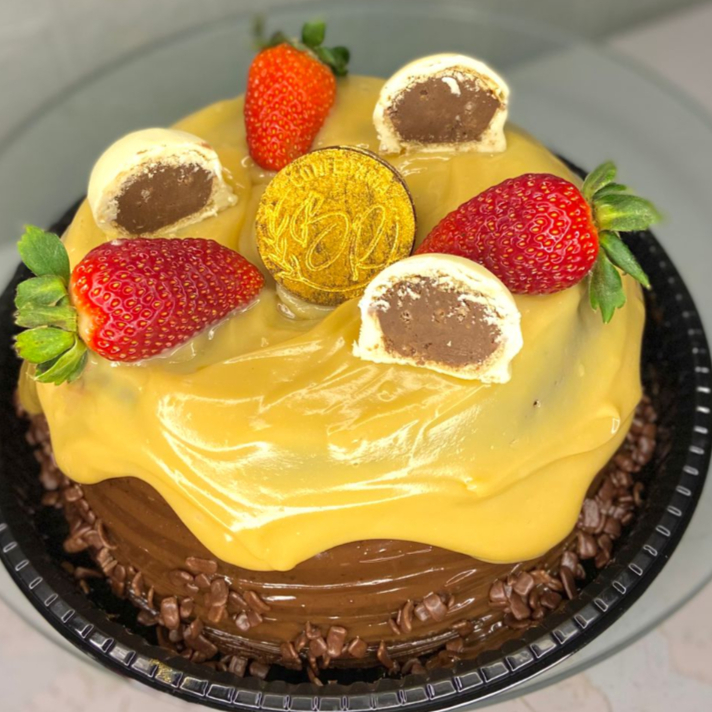 Coberto com nosso brigadeiro de chocolate 50% cacau, brigadeiro de ninho cremoso, granulado ao leite. Finalizado com bombom ouro branco e morangos. Pesando aprox 1kg