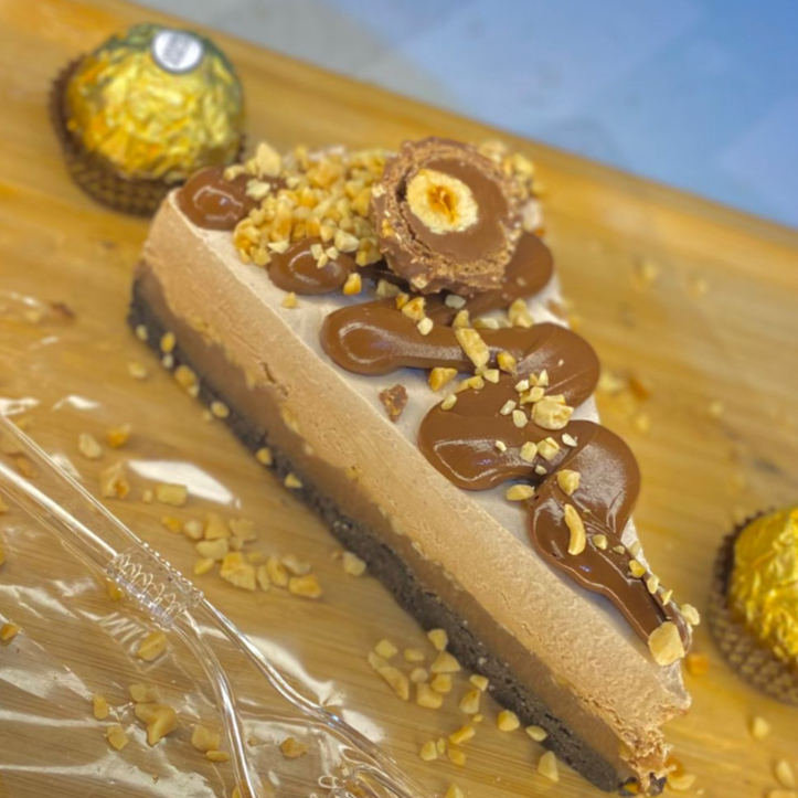 Massa a base de biscoito chocolate black, brigadeiro de chocolate 50% cacau, amendoim crocante. Finalizado com nutella e bombom ferrero rocher.