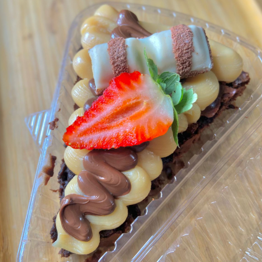 Nosso brownie super molhadinho, recheado com nosso brigadeiro de ninho cremoso, nutella. Finalizado com kinder bueno e morango.