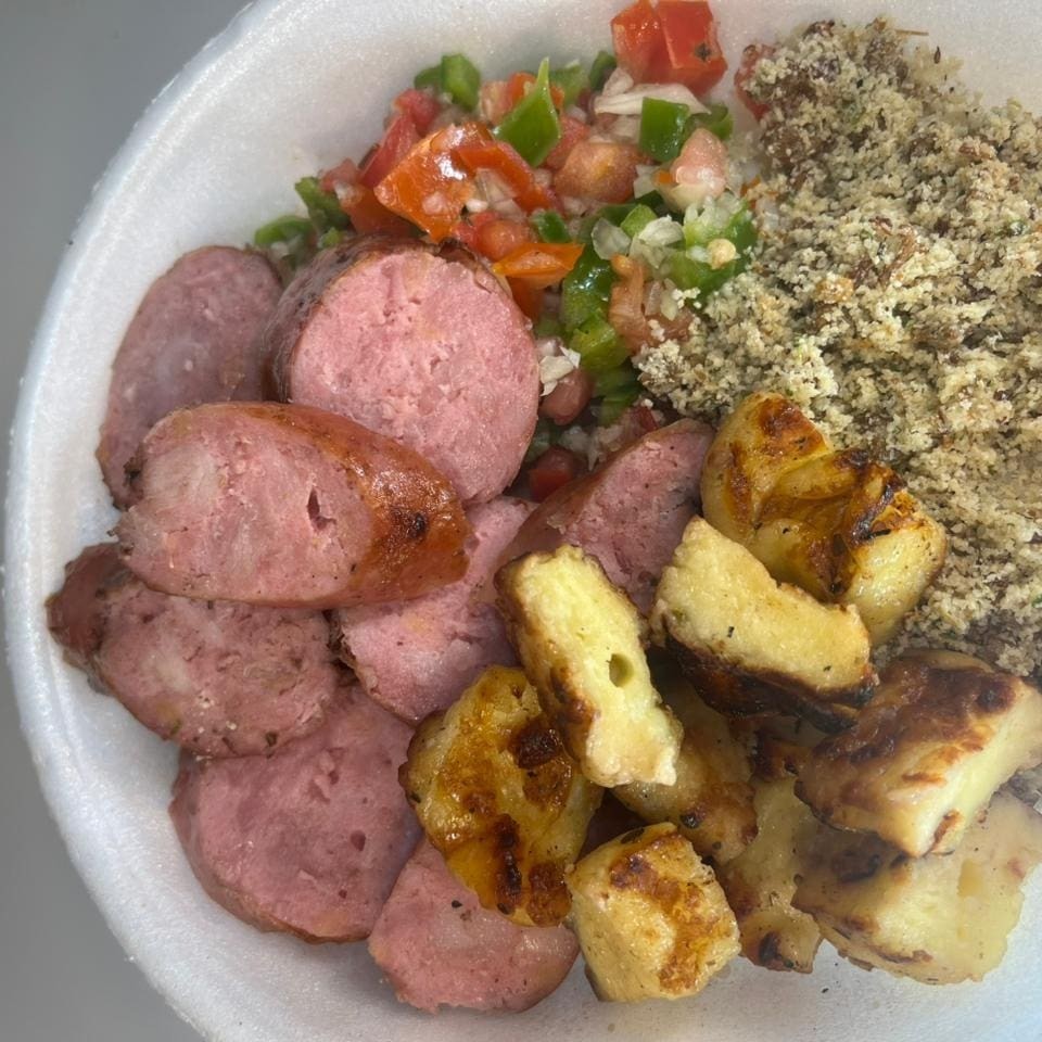 Arroz soltinho, farofa especial e molho fresco, acompanhados de linguiça toscana grelhada na brasa e queijo coalho dourado. Uma refeição completa, saborosa e com aquele toque artesanal do Brasa21