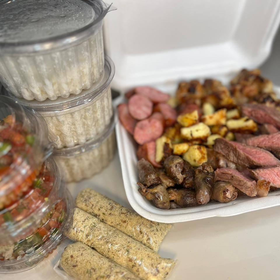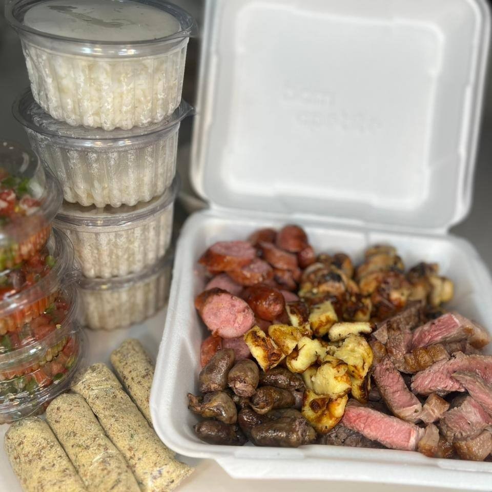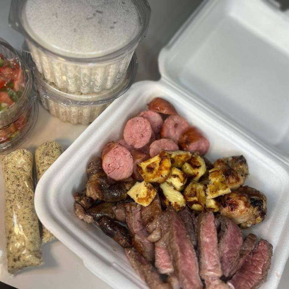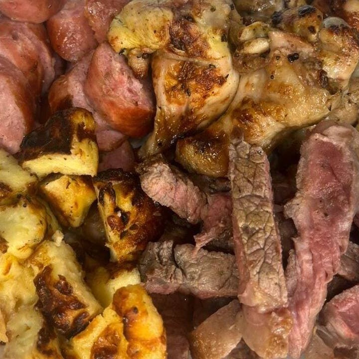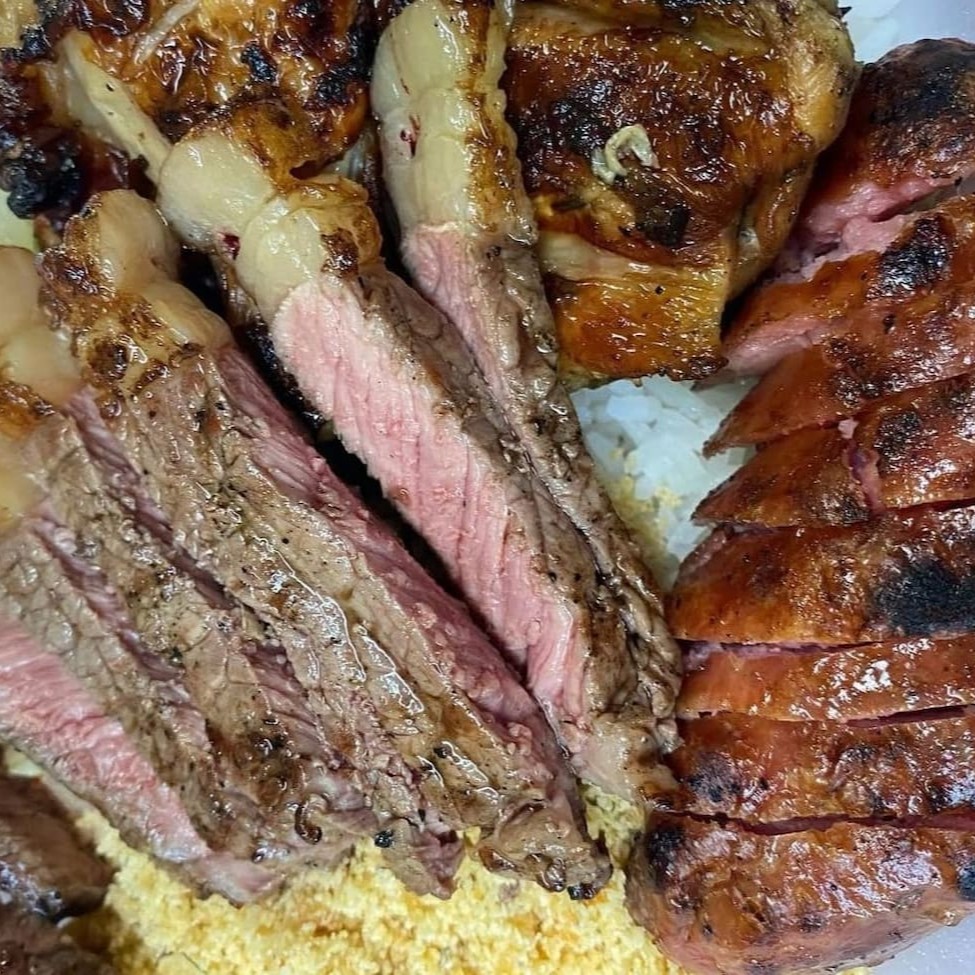 Combo generoso com contra filé macio, linguiças toscanas, drumets na brasa, coração e queijo coalho. Acompanha arroz soltinho, farofa especial e molho fresco. Uma combinação completa para compartilhar com mais sabor e fartura. Serve 3 pessoas.
