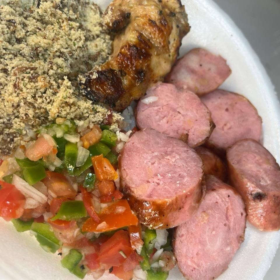 Arroz fresquinho, farofa crocante e molho artesanal, acompanhados de linguiça toscana grelhada e drumet no ponto certo da brasa. Uma refeição completa, sabor marcante e suculência de verdade.
