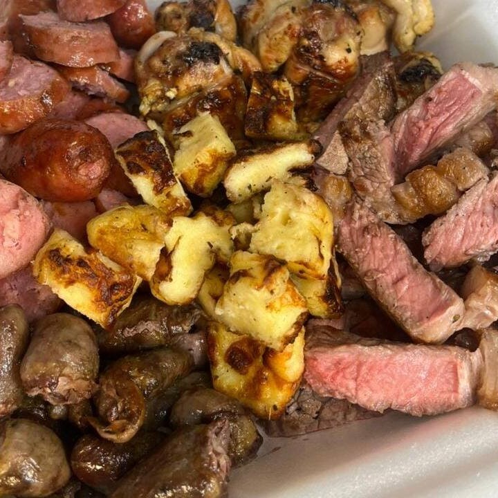 Seleção completa com contra filé grelhado, linguiças toscanas, drumets na brasa, coração e queijo coalho. Acompanha arroz soltinho, farofa crocante e molho fresco. Porção reforçada para aproveitar em família ou entre amigos com muito sabor e abundância. Serve 4 pessoas.