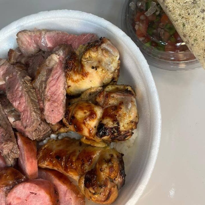 Prato feito de churrasco na brasa. Acompanha arroz soltinho, molho, farofa. Proteinas: Contra filé, 1 Drumet e 1 linguiça.