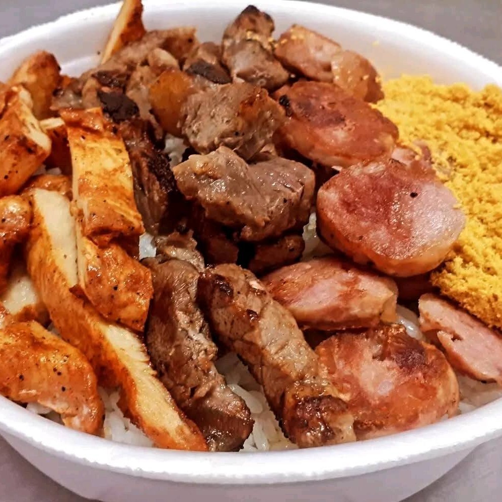 Quentinha De Churrasquinho Misto Com Arroz, Batata Frita, Molho E Farofa