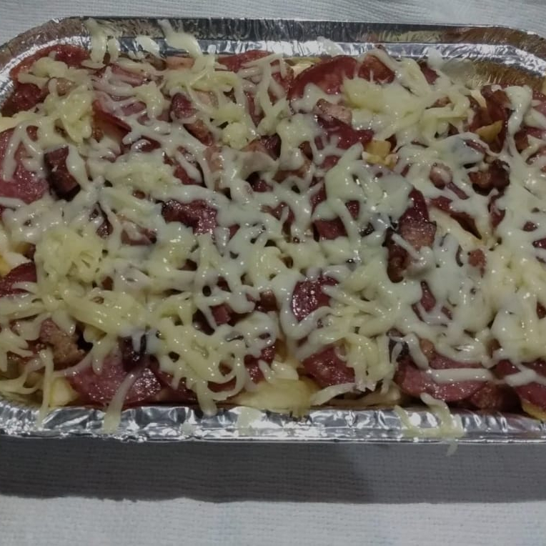 Tiras de frango empanada + batata , calabresa,bacon,mussarela