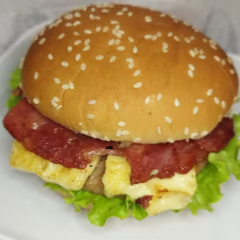 Pão.hamburguer empanado,cheddar fatiado,bacon,salada e molho verde.