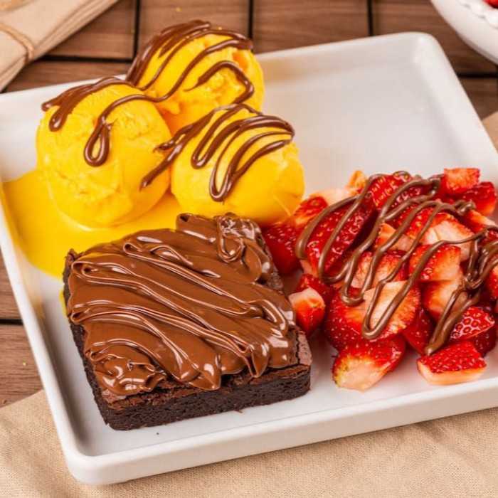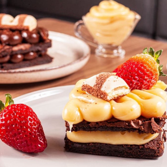 Desfrute em dobro da tentação de nosso Brownie! Este prato apresenta dois irresistíveis brownies.