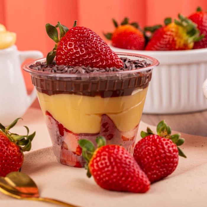 Mergulhe no paraíso com nosso irresistível Copo Mousse de Ninho com Morangos. O mousse é acompanhado por uma Coca-Cola.