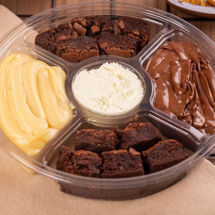 Delicioso fondue, ideal para compartilhar. Composto de: brownie, Brigadeiro de Ninho e calda de chocolate.