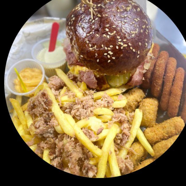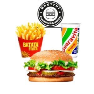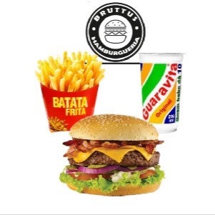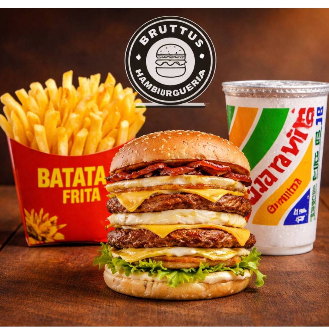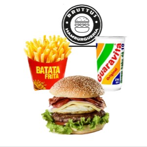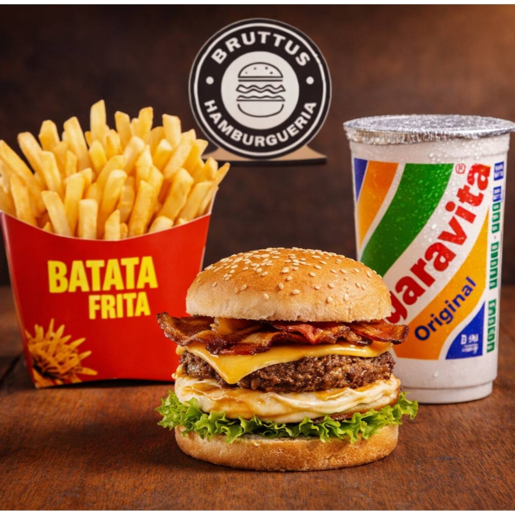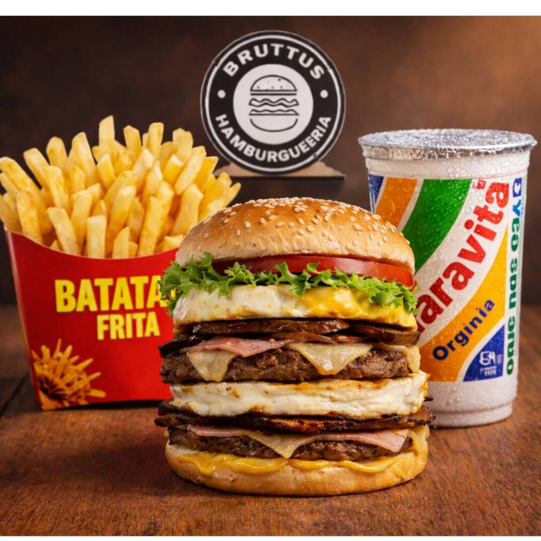 1 delicioso hambúrguer, podendo escolher dentre;( Big Bruttus, bruttus Triplo, Triplo Cheddar ou Triplo Requeijão) batata 07mm que leva cheddar Melt, Requeijão, Maionese temperada, Billy Jack alho torrado, orégano, bacon, 6 nugget e 6 anéis de cebola
