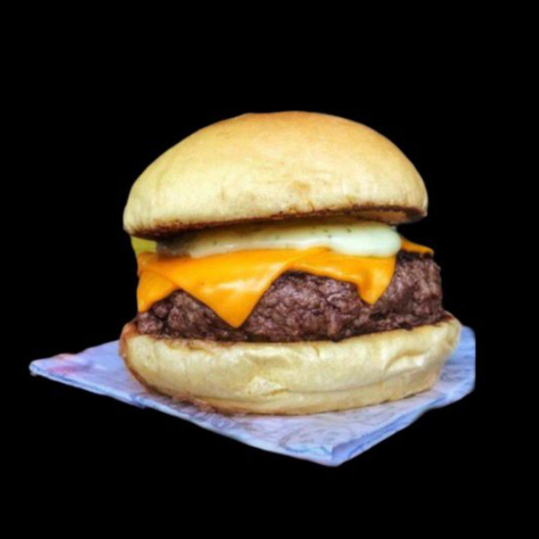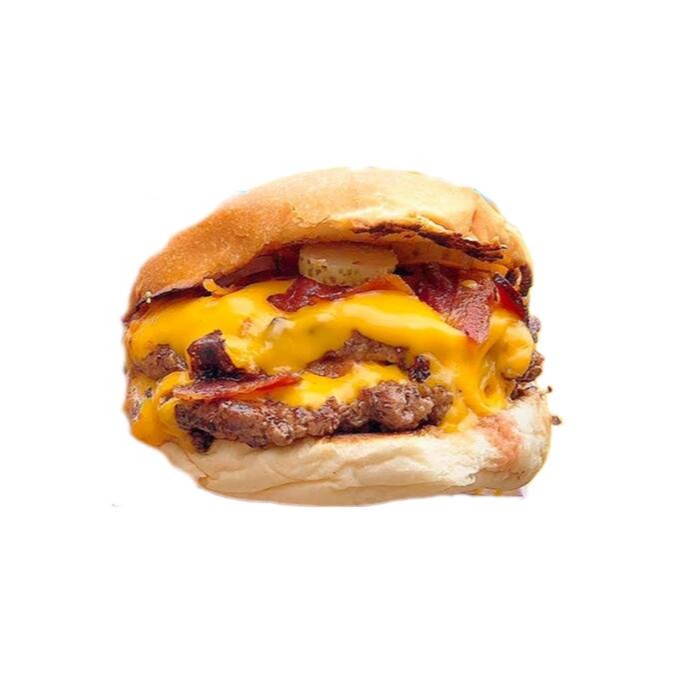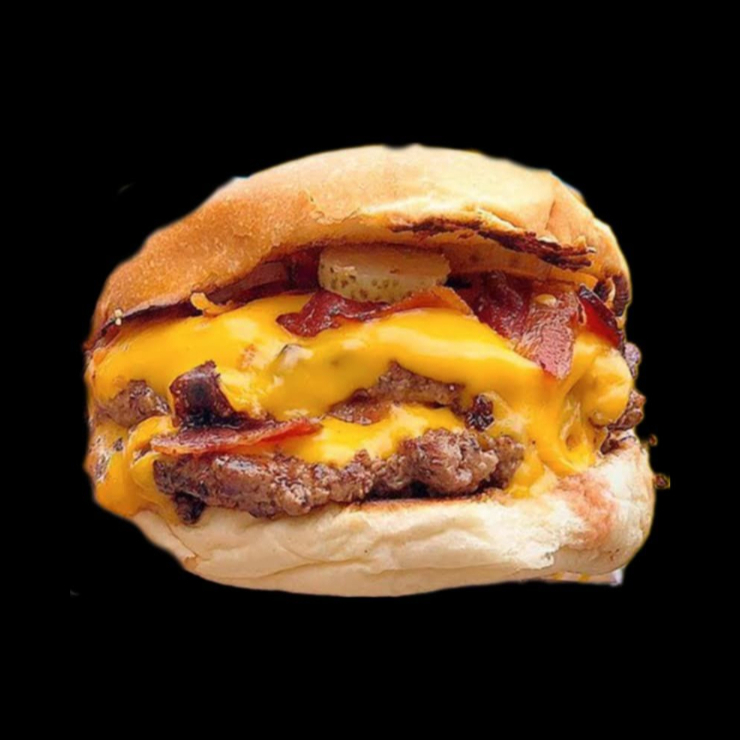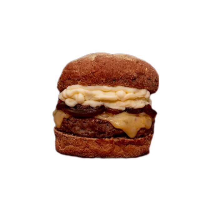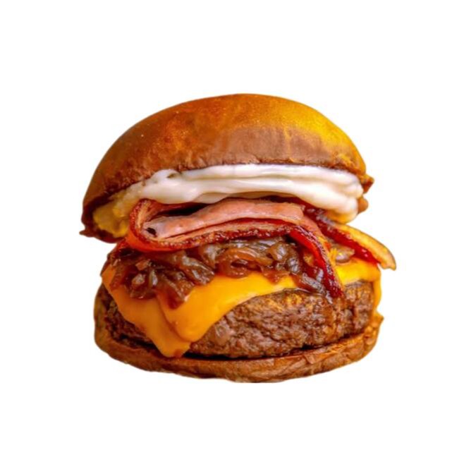 Pão de Brioche 55g, uma suculenta carne de 80g artesanal, feita na hora, cheddar cremoso derretido ao fogo, farofa de Bacon, cebola caramelizada, Queijo Prato, Molho Especial da Casa