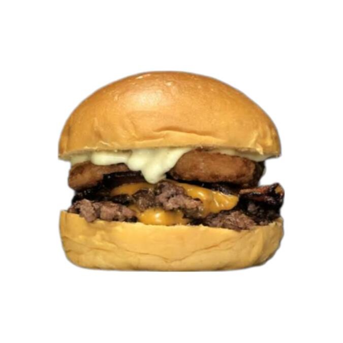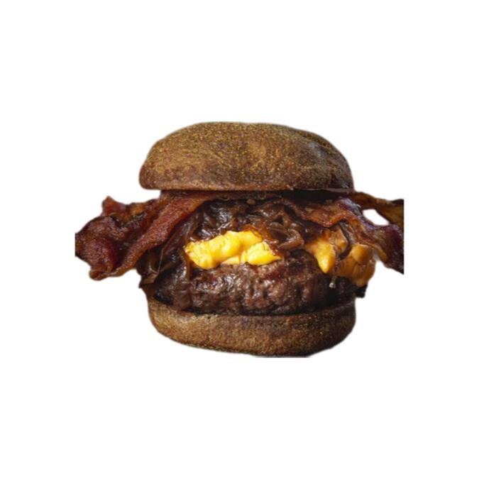 Pão de Brioche 55g, um delicioso blend 80g, 3 onion rings, Cheddar Cremoso derretido ao fogo, queijo prato, farofa de Bacon, cebola caramelizada, molho especial da casa