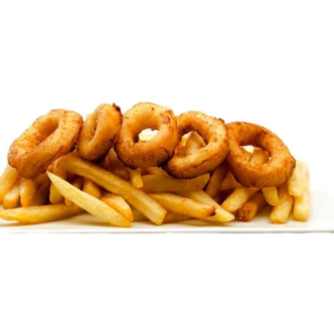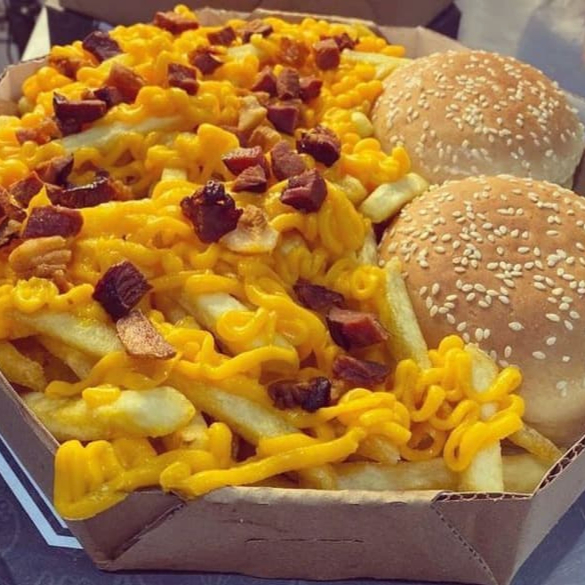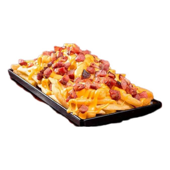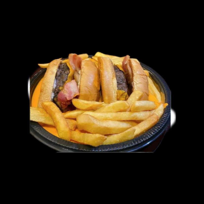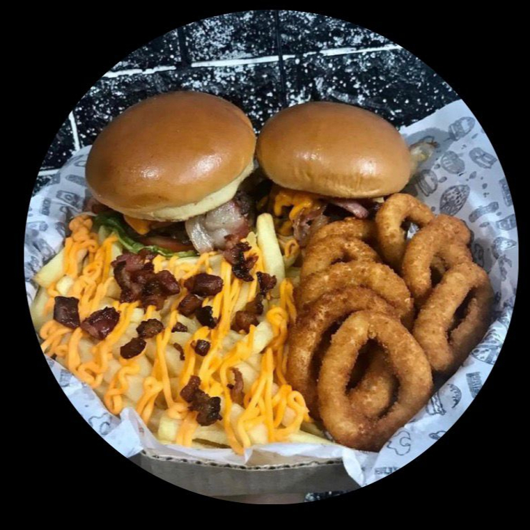 1 Smash Bacon, 1 Smash Cheddar + 1/2 porção de fritas completa ( Catupiry, Cheddar Cremoso, Billy Jack, Maionese Temperada e Bacon) 10 anéis de cebola