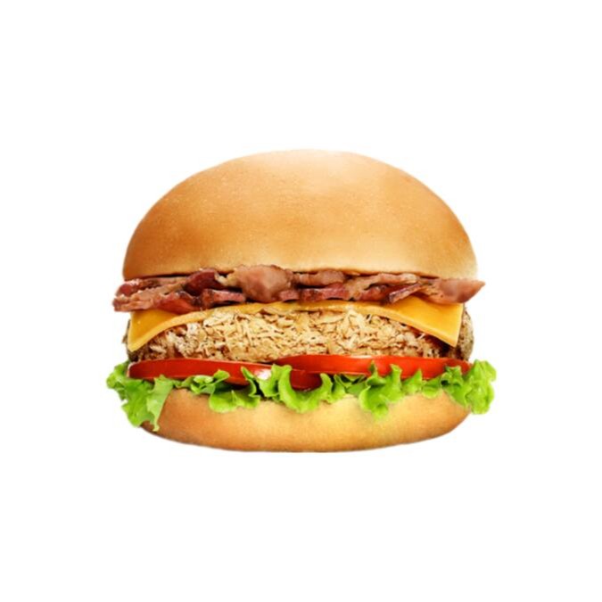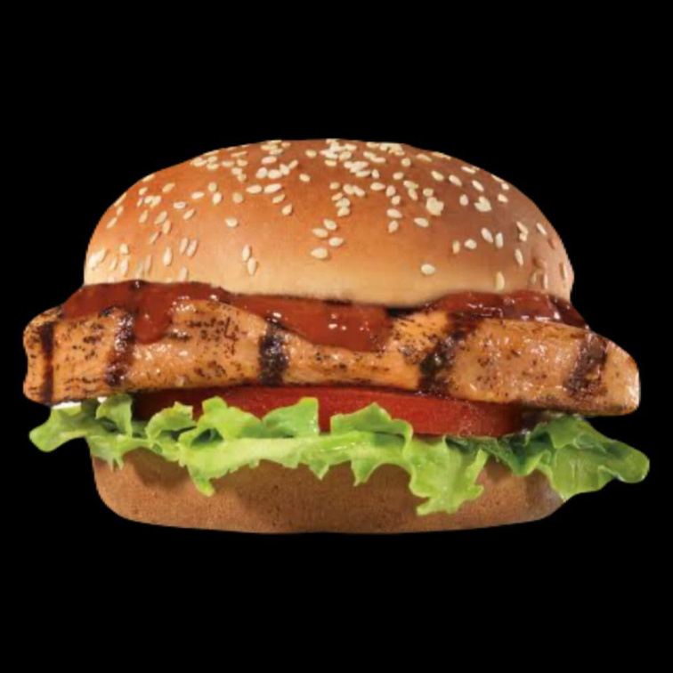 Pão de gergelim, filé de frango grelhado ao molho barbecue, queijo prato, cebola caramelizada, farofa de bacon, alface, tomate, picles e maionese temperada