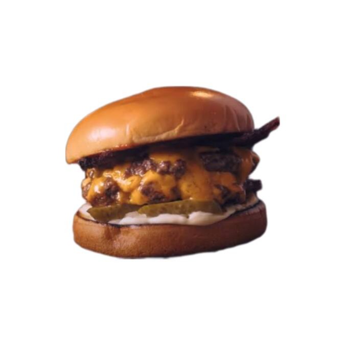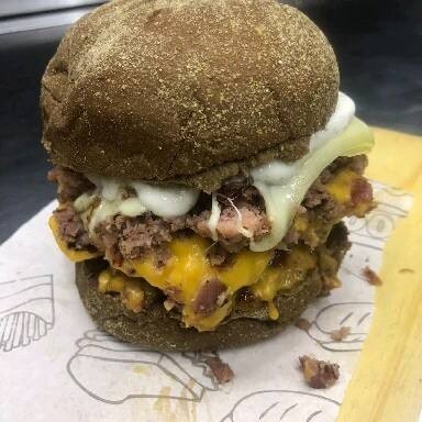 Pão Brioche 55g, 2 deliciosos Blend 80g, Cheddar Cremoso derretido ao fogo, queijo prato, bastante Picles, farofa de Bacon, cebola caramelizada, Molho especial da casa