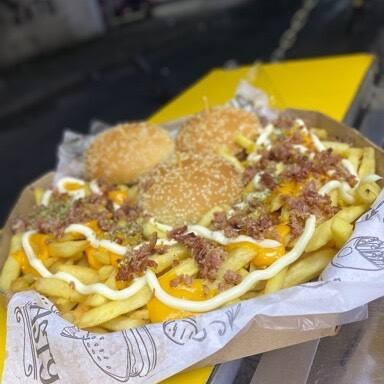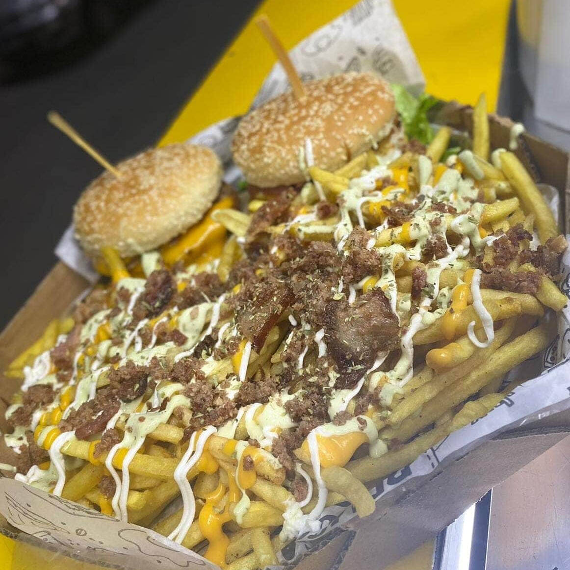 2 Deliciosos Burguer no pão de gergelim, a escolher( egg bruttus, Bruttus Calabresa ou Bruttus Bacon) mais batata G na caixa de de 25cm, coberta com cheddar, bacon, maionese da casa ,Billy jack , alho torrado, orégano e nosso delicioso Requeijão