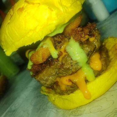 Pão de Brioche de 55g, uma suculenta carne de 80g Artesanal feito na hora, Requeijão Polenguinho, Farofa de Bacon, Queijo Prato, Cebola caramelizada, Cebola Cryspe, Molho Especial Da Casa