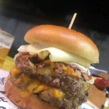 2 Blends de 150gr cada + farofa de bacon + cebola caramelizada + 2 Polenguinho + queijo derretido + molho Grill + Cheddar Cremoso