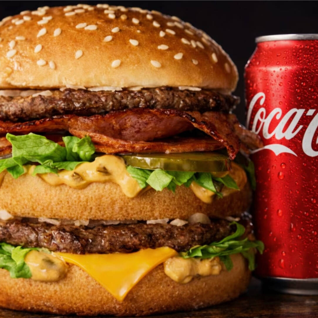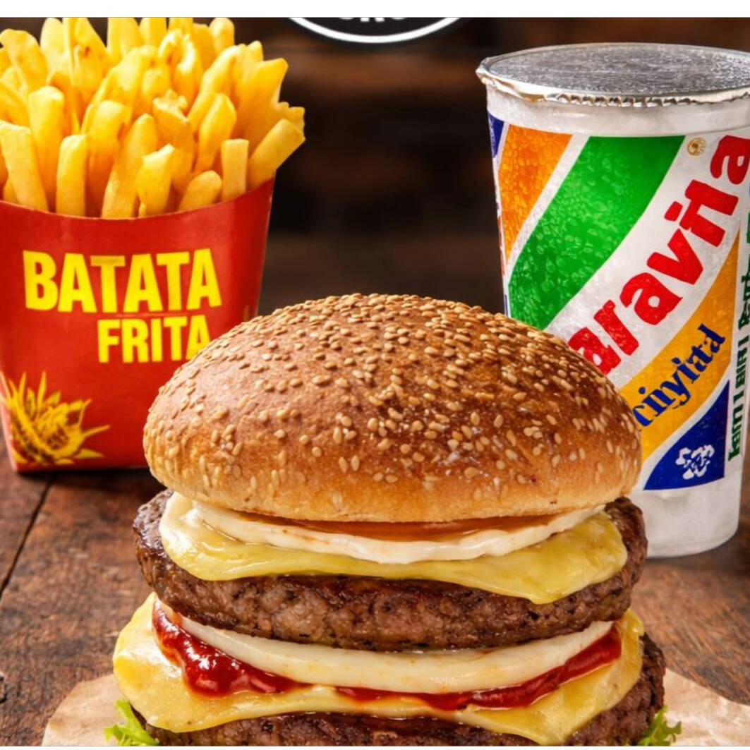 2 Carnes + Bacon + Queijo Duplo + Cheddar Cremoso + Alface + Tomate + picles +molho verde + molho billy jack + barbecue + Fritas + Guaravita